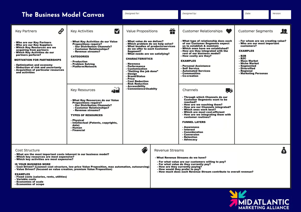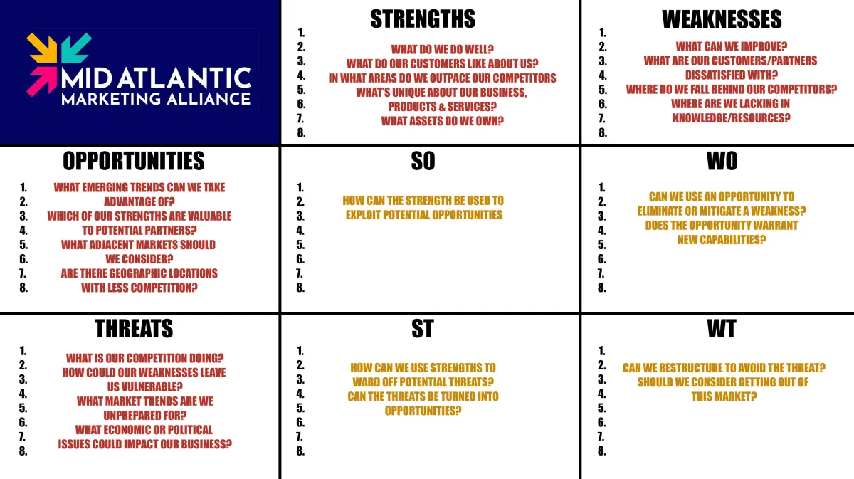 We will start by reviewing (or creating) your Business Model Canvas to ensure that your marketing goals are addressing all aspects of it -- and use a SWOT analysis to uncover strengths, weaknesses, opportunities, and threats impacting your success.