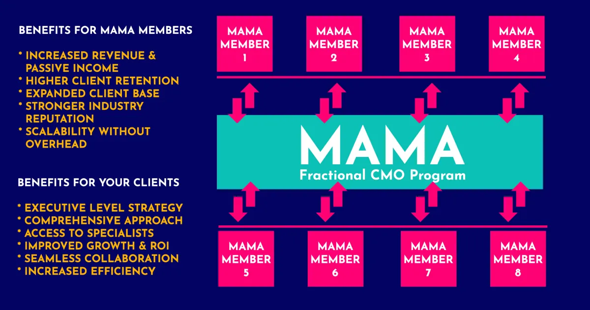 When you refer a client to MAMA for strategic marketing leadership, you’ll earn a percentage of MAMA’s recurring revenue—providing a passive income stream. Likewise, if MAMA brings in a client who needs your services, you have the option to offer a referral commission to MAMA. This creates a mutually beneficial financial model where everyone is incentivized to support one another’s success.